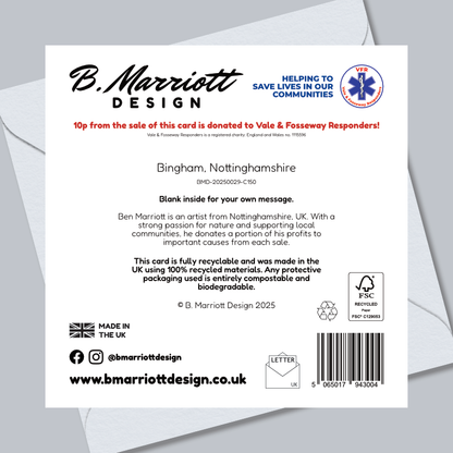 Part of the British travel and tourism range from contemporary artist Ben Marriott, this card also includes a donation to Vale & Fosseway Responders with each sale, helping to save lives in Bingham's local communities.