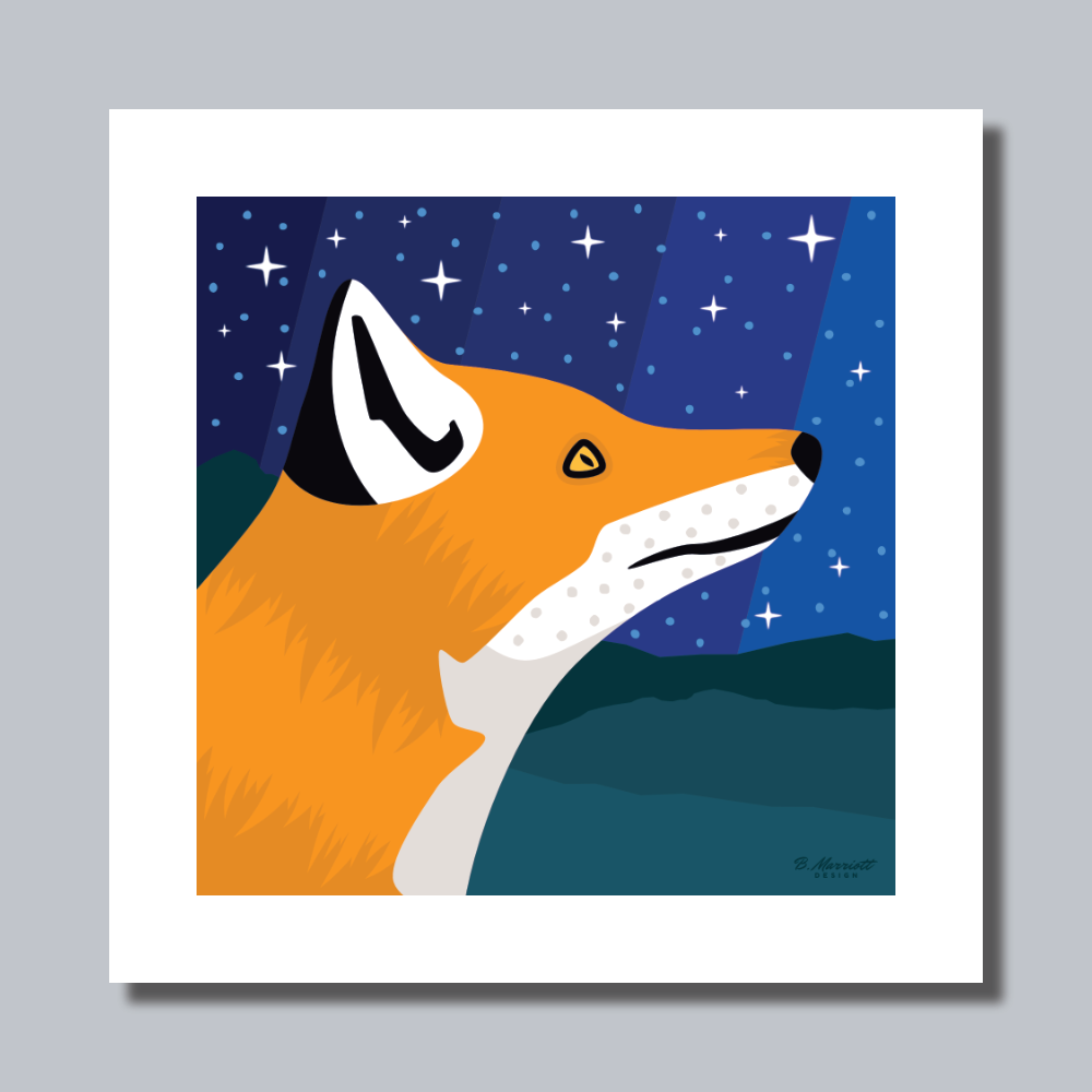 Elevate your space with the essence of nature through this bespoke art print from B. Marriott Design, featuring a graceful fox gazing up to the stars at night.