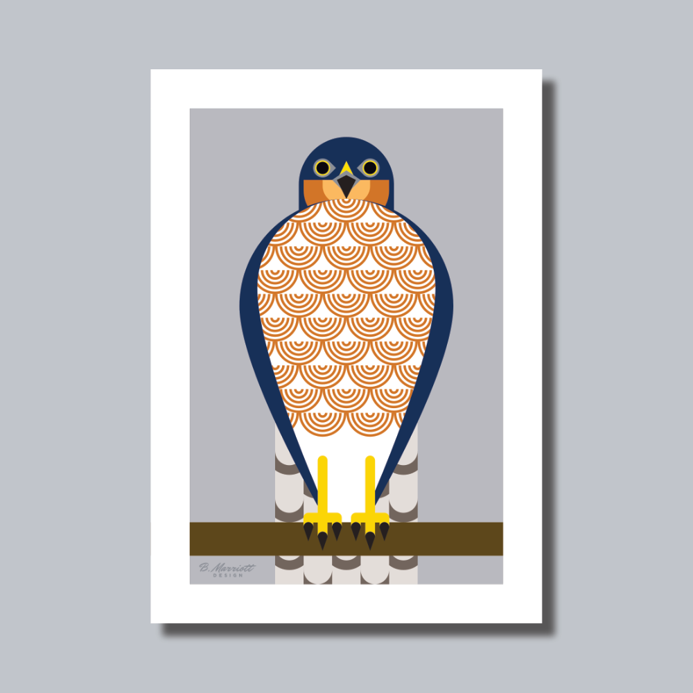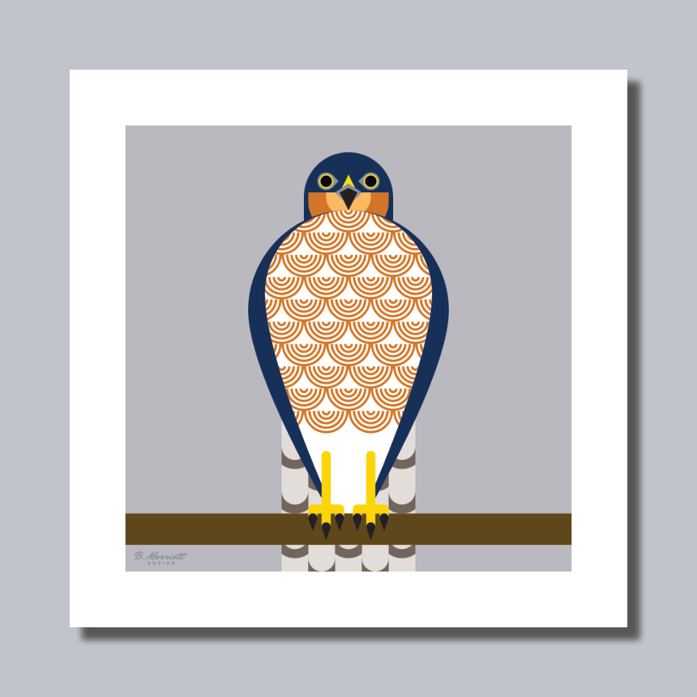 Elevate your space with the essence of nature through this bespoke art print from B. Marriott Design, featuring a stunning male sparrowhawk in a geometric style.