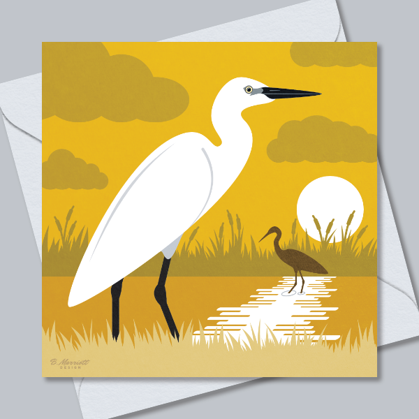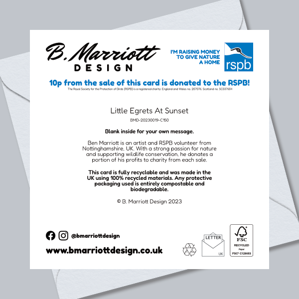 Part of the British birds and wildlife range from contemporary artist Ben Marriott, this card also includes a donation to the RSPB from each sale, helping to give nature a home with every purchase. Featuring a pair of little egrets wading on a shallow marsh at sunset, this wildlife greetings card is the perfect gift for any bird-lover!